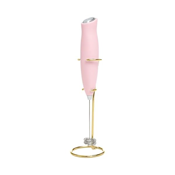 Paris Hilton Electric Handheld Milk Frother with Double Coil Head Whisk and Gold Metal Stand, Battery Powered (2 AA Batteries Required but Not Included), Pink