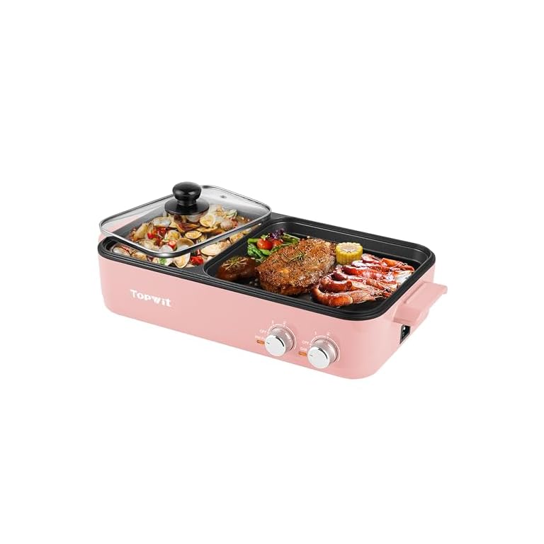 Topwit Hot Pot Electric with Grill, 2 in 1 Indoor Non-stick for Steaks, Shabu Shabu, Noodles, Simmer and Fry, Korean BBQ Grill, Independent Dual Temperature Control, Pink