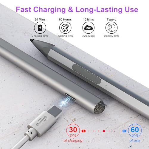 Type-C Fast Charging:The Surface Pro stylus pen introduces a Type-C fast charging design and built-in rechargeable battery, enabling you to recharge it quickly. With just 30 minutes of charging, you can enjoy a remarkable 60 hours of usage. Additionally, to optimize battery consumption and extend its usage time, the pen automatically powers off after 10 minutes of inactivity. This feature greatly enhances its efficiency and preserves battery life