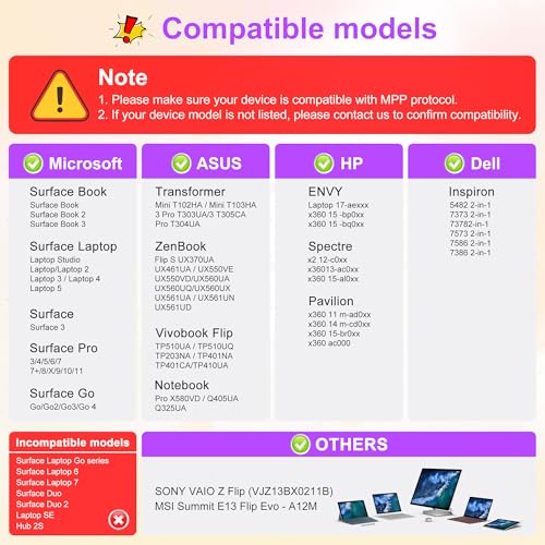 Compatible Models: Stylus Pen for Surface compatible with Surface Pro 3/Surface Pro 4/Surface Pro 5/Surface Pro 6/ Surface Pro 7/ Surface Pro 8/Surface Pro 9/Surface Pro 10/Surface Pro 11/Surface 3/Surface Book/Book 2/Book 3/Surface Laptop/Laptop 2/Laptop 3/Laptop 4/Laptop 5/Surface Studio/Studio 2/Surface Go/Go 2/Go 3/Go 4 ; Not compatible with Surface Laptop Go series and Surface Laptop 6/Laptop 7