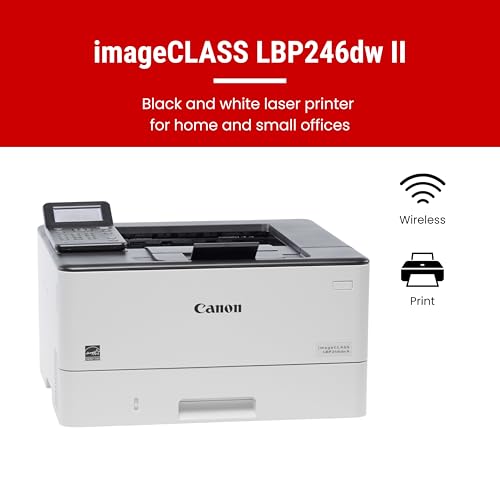 Designed for small / home offices and hybrid work environments, the imageCLASS LBP246dw II model balances speedy performance and minimal maintenance. The LBP246dw II is easy to set up and has a 5-line LCD screen. Print crisp black and white documents with fast print speeds of up to 42 pages per minute, using high quality Canon Genuine Toner 070 / 070 H. Duplex (2-sided) printing helps save paper and limit replacements. The LBP246dw II offers a plain paper capacity of up to 250 sheets in the standard cassette, 100 sheets in the multipurpose tray, and an expandable paper capacity of up to 900 sheets using optional cassette AH-1 which holds up to 550 sheets. Easily connect wirelessly from computers or mobile devices. Print using a variety of mobile apps, including the Canon PRINT app using your compatible mobile device. The LBP246dw II comes with a 1-year limited warranty and is backed by Canon’s Service and Support network.