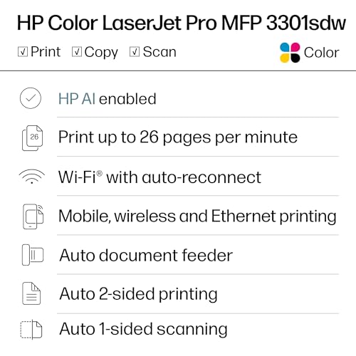 HP Color LaserJet Pro MFP 3301sdw Wireless All-in-One Color Laser Printer, Office Printer, Scanner, Copier, ADF, Duplex, Best-for-Office (499Q3F)