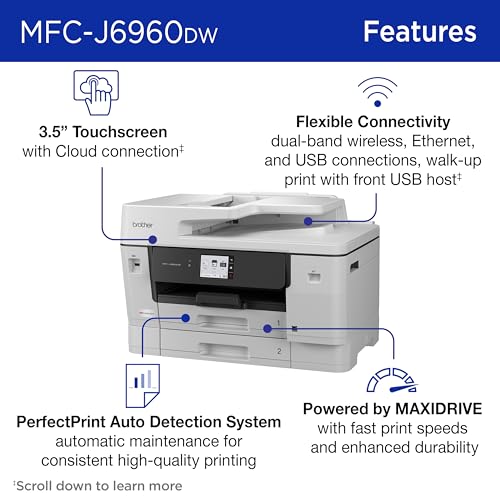 The INKvestment 6960 Wireless Color Inkjet All-in-One Printer was designed with impressive business-minded features to tackle your most robust day-to-day tasks. Optimize your productivity with print, copy, scan, and fax capabilities up to 11” x 17”, single-pass duplex (2-sided) copy and scan capabilities for up to 50-sheets via the automatic document feeder (ADF)(3), a 500-sheet paper capacity between two trays, and 100-sheet multi-purpose tray(3). Convenient dual band wireless(4) and Cloud connectivity options(6) are available on the 3.5” color touchscreen. Maintain superior productivity from day one with fast print speeds and the right amount of ink in-box. This color inkjet printer reliably outputs vibrant colors and bold, rich blacks, and Page Gauge(8) monitors your ink usage so you know when you’re running low. When paired with the Brother Mobile Connect app, setup is quick and easy – plus, you’ll gain the ability to print from virtually anywhere on your mobile device(7). Produce beautiful prints in vibrant color and bold blacks at fast print speeds with Brother Genuine LC506 Ink cartridges – the only brand Brother recommends for your Brother printer. Try one of Brother’s smart delivery systems with Refresh and have your ink delivered automatically, before you run out. Includes a 2-month FREE Refresh EZ Print Subscription Trial(1) and built-in savings of up to 50%(9). Disclaimers (1) Refresh Free Trial requires enrollment in a monthly billed Brother Refresh EZ Print Subscription service plan based on monthly printed page allotments. Unused pages roll over, limitations apply. Additional page set charges and taxes apply during trial. Plan, options offer and pricing subject to change. Open to new subscribers located in the contiguous United States only. After any applicable free trial period, your subscription service plan will automatically continue and your credit card will be charged on a monthly basis for the Plan Fee, Taxes and Additional Page Sets (if applicable) in accordance with the Program Terms of Service until you cancel, which you may do at anytime. If your printer did not include a Refresh ready cartridge at purchase, upon cancellation, the subscription cartridge you received will be deactivated and must be replaced with a standard cartridge at your expense in order to continue printing. For full details or to enroll, visit https://www.brother-usa.com/supplies/subscription-info. (2) Approximate page yields in accordance with ISO/IEC 24711. For additional page yield information, see go.brother/pageyield. (3) Maximum Capacity based on using 20lb. paper. (4) Wireless connection required. (5) Based on ISO/IEC 24734 (after first set of ISO test pages). For inkjet print speed methodology, please visit www.brother-usa.com/printspeed. (6) Requires an internet connection and an account with desired service. (7) Free Brother Mobile Connect App download, wireless connection and connection of an eligible printer with Brother are required. Compatibility may vary by device, operating system and country. (8) Page Gauge is an estimate for informational purposes only. For actual cartridge yield information refer to go.brother/pageyield. (9) Based on combined value of the included extended limited warranty plus monthly subscription cost in U.S. vs. purchase of an extended limited warranty plus average cost per page of standard replacement cartridges. Savings will vary based on Refresh EZ Print Subscription plan selected. (10) USB Host JPEG only.