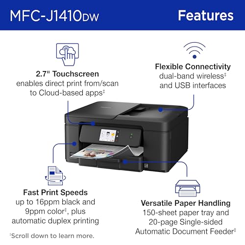 Experience true reliability, efficiency, and ease of use with the Brother Work Smart 1410 Wireless Color Inkjet All-in-One Printer. Brother inkjet printers produce beautiful prints in vibrant color or rich black & white for results you can be proud of, from to-do lists and home calendars to flyers and business reports. A 2.7” color touchscreen display lets you connect to popular Cloud apps(2) directly from your printer. Automatic duplex printing, a 20-sheet single-sided automatic document feeder(3) and flatbed scanner/copier capabilities, and a 150-page paper tray(3) bring modern convenience to this compact printer. Engineered to produce great prints, this color inkjet printer outputs vibrant colors and bold, rich blacks at fast print speeds, and Page Gauge(6) monitors your ink usage so you know when you’re running low. When paired with the Brother Mobile Connect app, setup is quick and easy – plus, you can print from virtually anywhere on your mobile device(5). Print Confidently with Brother Genuine LC501 Ink in your Work Smart 1410 for reliable, consistent prints – with multipack and high yield cartridge options for added convenience. Try one of our smart delivery systems with Refresh and have your ink delivered automatically, before you run out. Includes a 2-month FREE Refresh EZ Print Subscription Trial(1) and built-in savings of up to 50%(7). Disclaimers: (1) Refresh Free Trial requires enrollment in a monthly billed Brother Refresh EZ Print Subscription service plan based on monthly printed page allotments. Unused pages roll over, limitations apply. Additional page set charges and taxes apply during trial. Plan, options offer and pricing subject to change. Open to new subscribers located in the contiguous United States only. After the free trial period, your credit card will be charged on a monthly basis for the Plan Fee, Overages and Taxes in accordance with the Terms of Service. Overage fees will apply during free trial. Your service will continue on a month-to-month basis until you cancel it. May be canceled at any time. Upon cancelation, cartridge will be deactivated and must be replaced at user’s expense in order to continue printing. For full details or to enroll, visit: https://www.brother-usa.com/supplies/subscription-info (2) Requires an internet connection and an account with desired service. (3) Maximum Capacity based on using 20lb. paper. (4) Based on ISO/IEC 24734 (after first set of ISO test pages). For inkjet print speed methodology, please visit www.brother-usa.com/printspeed. (5) Free Brother Mobile Connect App download, wireless connection and connection of an eligible printer with Brother are required. Compatibility may vary by device, operating system and country. (6) Page Gauge is an estimate for informational purposes only. For actual cartridge yield information refer to go.brother/pageyield. (7) Based on combined value of the included extended limited warranty plus monthly subscription cost in U.S. vs. purchase of an extended limited warranty plus average cost per page of standard replacement cartridges. Savings will vary based on Refresh EZ Print Subscription plan selected.