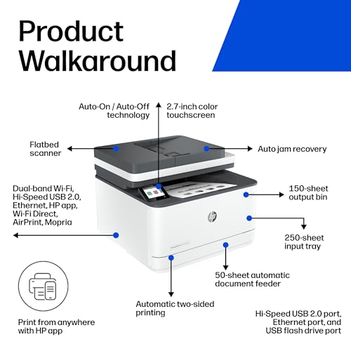 This LaserJet Pro printer is built with powerful productivity features for small teams – fast speeds, built-in security, and cloud connectivity so you can setup and manage it from anywhere.HP Office Laser Multifunction Printers are designed for SMBs and small workteams in larger companies, delivering enhanced productivity, simplified workflows and reduced costs.This printer uses dynamic security, which may be updated periodically by firmware updates. The printer is intended to be used solely with cartridges using an original HP chip. Cartridges using a non-HP chip may not function or may cease to function. More at:www.hp.com/learn/ds Powerful productivity. Support your small workteams with this smart printer, designed for up to 7 users.Print more efficiently. Save time, paper, and costs with fast printing, scanning and auto two-sided printing.Do more in fewer steps. Simple shortcuts allow your employees to complete common tasks with just a touch.Get productivity in the palm of your hand. Print, scan, and save time with Shortcuts from HP Smart. Seamless management. Centralize print management for your enterprise. HP Web JetAdmin makes it easy with its suite of features.Set up your printer quickly wherever work happens. Cloud connectivity makes it easy for your IT team.Access your printers from a single dashboard. Smart Admin guides you through setup and gives IT visibility. Avoid interruptions with Wi-Fi® that intelligently looks for the best connection to stay on-line HP Wolf Pro Security. Get printer security out of the box. Preconfigured settings mean it’s ready when you are.Set up and manage your printers from a single dashboard. Smart Admin makes the experience seamless. Add a layer of security. PIN/pull option authenticates your print jobs only when you’re present.Set configuration policies and validate settings universally with HP JetAdvantage Security Manager. Hassle-free supplies management with Instant Ink for lasers. Enroll to save on Original HP Toner with Instant Ink. Get toner, delivery and recycling. Never run out of toner with Instant Ink for lasers. Cartridges are delivered automatically and only when you need it.Manage your subscription to get cartridges delivered to multiple locations on a single consolidated bill.With Instant Ink, you get to select the right plans for each of your printers. Change or cancel at any time.