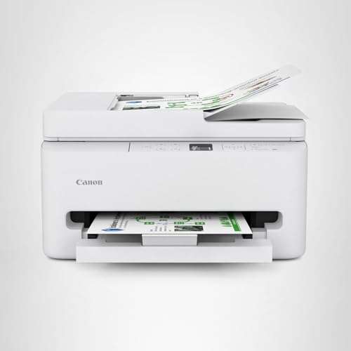 Dimensions: 13.8″H x 16.73″W x 19.7″D. Types of media supported include cardstock, matte paper, glossy photo paper, plain paper, photo paper, and envelopes. Fax memory accommodates up to 550 pages for snag-free operation. Automatic two-sided duplexing enables hands-free two-sided copying; features an auto feeder with a 50-sheet capacity.