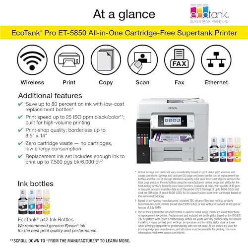 The EcoTank Pro ET-5850 wireless all-in-one offers fast Cartridge-Free Printing with easy-to-fill supersized ink tanks. You can save up to 80 percent with low-cost replacement ink bottles vs. standard-capacity color laser toner cartridges (1) – about 2 cents per color ISO page versus 14 cents with cartridges (1). PrecisionCore Heat-Free Technology delivers high-volume, print-shop-quality output, plus speeds up to 25 ISO ppm black and color (ƚ). This all-in-one with Epson DURABrite pigment-based ink delivers vibrant borderless prints up to 8.5″ x 14″. Each replacement ink set includes enough ink to print up to 6,000 pages (2). Plus, there’s zero cartridge waste and very low energy consumption (3). The ET-5850 features a 500-sheet front tray paper capacity and rear specialty-paper feed, plus a 4.3″ color touchscreen and hands-free voice-activated printing (4). The NPD Group, Total Channel Tracking Service, U.S. & Canada, Inkjet SF/MF Printers, Refillable ink tank included, based on units, February 2019 – January 2020. Supertank printers are defined as refillable ink tank printers. Promo valid for ET-5150, ET-5170, ET-5180 ET-5800, ET-5850, ET-5880, ET-16600 or ET-16650 printers purchased from 10/1/2021 to 3/31/2025. Product must be registered within 30 days of purchase. Limit four 542 ink bottles per claim. Each claim cannot contain multiple bottles of the same color. Retain your empty 542 ink bottle for submission along with rebate form. Promotion applies to ink only. Printer covered by Epson 2-year ltd warranty with registration. For promo participation, you must register your product. See manufacturer’s website for details. Ƚ Black and color print speeds are measured in accordance with ISO/IEC 24734. Actual print times will vary based on factors including system configuration, software, and page complexity. 1. Actual savings and costs will vary considerably based on print tasks, print volumes and usage conditions. Savings and cost per ISO page are based on the cost of replacement ink bottles and the cost of enough standard-capacity color laser toner cartridges to achieve the total page yields of the ink bottles using the manufacturers’ online prices and yields for the best-selling similarly featured color laser printers, available at retail, priced at $999 or less (USD) with speeds of 40 ppm or less per industry-available data as of July 2019. Savings of up to $600 (USD) and cost per ISO page of about 0.09 dollars (USD) for XL-capacity color laser toner cartridges based on the same methodology. 2. Part of the ink from the included bottles is used for initial setup; yields are lower than those of replacement ink bottles. Replacement and included ink bottle yields based on the ISO/IEC 24712 pattern with Epson’s methodology. Actual ink yields will vary considerably for reasons including images printed, print settings, temperature and humidity. Yields may be lower when printing infrequently or predominantly with one ink color. All ink colors are used for printing and printer maintenance, and all colors must be available for printing. 3. Based on comparing manufacturers’ reported TEC values of the best-selling, similarly featured color laser printers priced about 999 dollars (USD) or less with print speeds of 40 ppm or less as of July 2019. 4. Epson Connect account and voice-activated account registration required. 5. Most features require an Internet connection to the printer, as well as an Internet- and/or email-enabled device. 6. Wi-Fi CERTIFIED; level of performance subject to the range of the router being used. Wi-Fi Direct may require printer software. 7. 12 months of standard limited warranty or 80,000 plain paper sheets (whichever happens first). For an additional 12-month extended service plan (total of 24 months or 80,000 plain paper sheets, whichever happens first), register your product and use Epson genuine ink bottles. See Limited Warranty for details. 8. SmartWay is an innovative partnership of the U.S. Environmental Protection Agency that reduces greenhouse gases and other air pollutants and improves fuel efficiency.