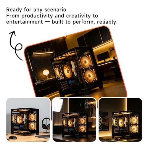 【Stylish ARGB Cooling & Quiet Operation】Multiple ARGB fans not only keep your system cool during intensive tasks but also add a vibrant touch to your workspace with customizable lighting effects. The intelligent airflow design ensures quiet operation, so you can focus on your work without distraction.
