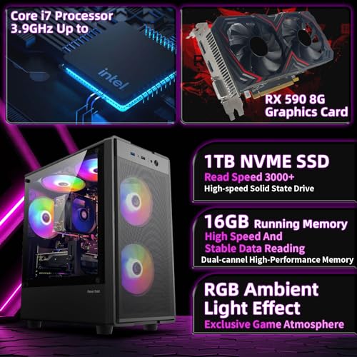 Prebuilt Gaming PC Desktop Computer,Intel Core i7 Desktop,Operating at A Frequency of 3.4-3.9 GHz,RX590 Graphics Card with 8GB GDDR5 Video Memory,16GB RAM, 1TB NVME SSD,WiFi 5.0,RGB Fan x5