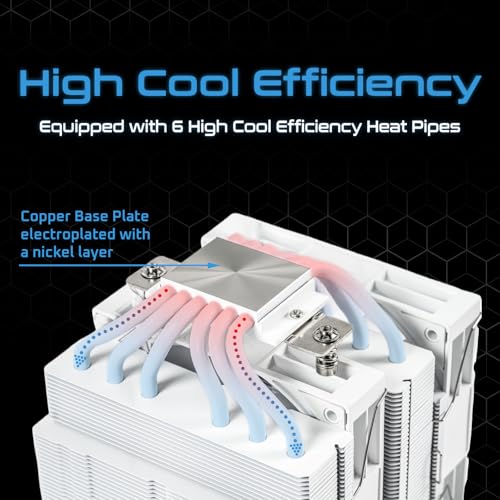 Efficient Cooling Performance CPU Air Cooler: Equipped with 6 copper heat pipes and a nickel-plated copper base plate to make the heat dissipation more efficient from the CPU, keeping your CPU temperatures low even under heavy loads