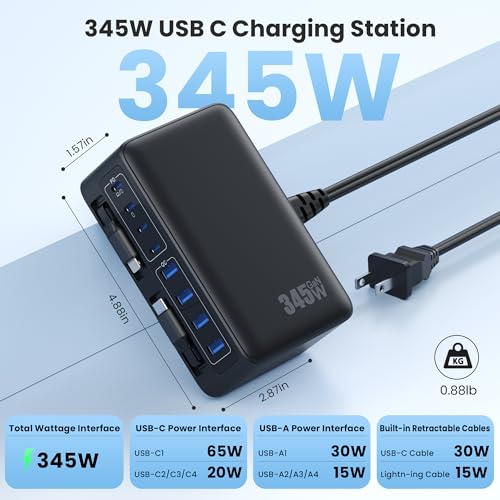 【10-in-1 design USB C Charger Station with 2 Built-in Retractable Cables】2026 upgraded 10 in 1 retractable charger wall plug has built-in dual retractable cables (USB-C Cable+for iPhone Cable)and 8 USB ports (4 USB-C+4 USB-A) sharing 345W of power, can power up to 10 devices simultaneously. Perfect for the home, office and travel. Its various charging interfaces can meet our daily charging needs to the greatest extent. And retractable functions can be easy to organize and carry, Ideal for home, office,travel essentials.