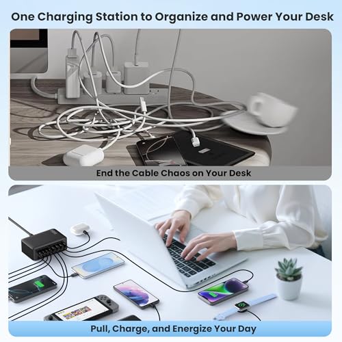 【Widely Compatible USB C Charging Station】The 10 in 1 multiports USB C Charging Station equipped with 2 Built-in Retractable Cables and 8 USB ports can charge all your devices with ease. Widely compatible with laptops(Macbook Pro/Air,DELL,HP etc.),tablets(for iPad,Samsung Tab,Google Pixel Slate,Amazon Fire HD10/Kindle Fire HD 10 and more),Smartphones(iPhone17/16/15/14/13/12/11/X/8/7/6/SE series,Samsung GalaxyS25/24/23/22/21,Google Pixel,LG,more Android Cellphones),Smartwatch,Power Bank and more.