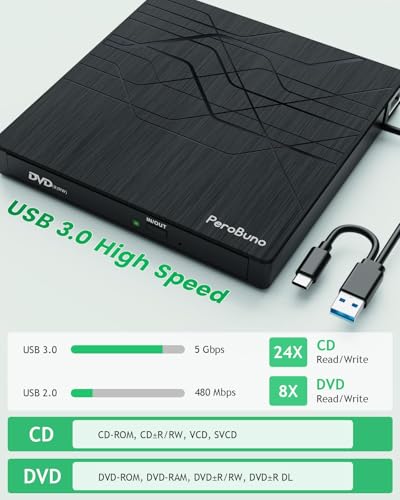 【Powerful External CD/DVD Drive for Mac PC】Considering that most of the latest laptops and desktop computers are not equipped with the internal CD/DVD drive, network interface, SD/TF card slot, and the number of USB interfaces is generally insufficient. This latest PeroBuno full-featured USB 3.0 external DVD drive is the perfect solution for most computers. Just plug the data cable (on the back of the external CD drive) into your computer’s USB-A or USB-C port, then you can start using all the above features. Your computer will automatically recognize it and come with drivers, no complicated settings required, Plug and Play!