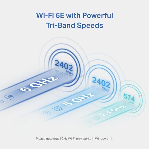 𝐓𝐫𝐢-𝐁𝐚𝐧𝐝 𝐔𝐒𝐁 𝐖𝐢𝐅𝐢 𝐀𝐝𝐚𝐩𝐭𝐞𝐫 – Reach incredible speeds up to 2.4 Gbps (2402 Mbps in 6GHz, 2402 Mbps in 5 GHz or 574 Mbps on 2.4 GHz) with ultra-low latency and uninterrupted connectivity using Wi-Fi 6E technologies. 𝐓𝐨 𝐮𝐭𝐢𝐥𝐢𝐳𝐞 𝟔𝐆𝐇𝐳 𝐖𝐢-𝐅𝐢, 𝐭𝐡𝐞 𝐮𝐬𝐞𝐫 𝐧𝐞𝐞𝐝𝐬 𝐭𝐨 𝐛𝐞 𝐮𝐬𝐢𝐧𝐠 𝐖𝐢𝐧𝐝𝐨𝐰𝐬 𝟏𝟏.