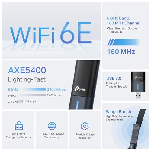 As the perfect solution for gamers and streamers in need of the fastest and most reliable Wi-Fi connection possible, the Archer TXE70UH enhances your Wi-Fi experience in seconds. You can enjoy quicker downloads and uploads of large movie and video game files, smoother streaming of high-definition videos and online gaming, and improved connectivity performance for applications that demand low latency, such as virtual reality and augmented reality using the latest Wi-Fi 6E technology. Featuring the latest USB standard, USB 3.0, download and upload speeds will be up to 10 times faster than traditional USB 2.0. And thanks to its plug-and-play setup, you can have your fast and stable Wi-Fi 6E connection up and running almost instantly.