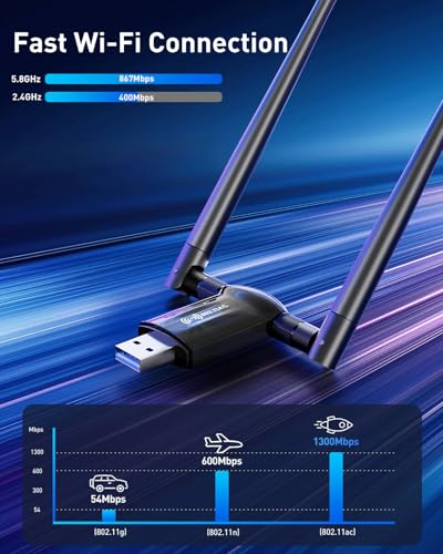 【Fast Dual-Band 5Ghz and 2Ghz】USB WiFi: Switch effortlessly between 5.8GHz mode (up to 867Mbps) and 2.4GHz mode (up to 400Mbps). This dual-band wifi usb adapter for pc solves the problem of having only a built-in 2.4G wifi dongle , and wifi usb delivers faster internet speeds and stronger, more reliable signal penetration over long distances with wifi antenna ,is perfect for streaming, games, 4k Video ,online meeting,and working online,It’s a wireless usb adapter perfect for the modern user.