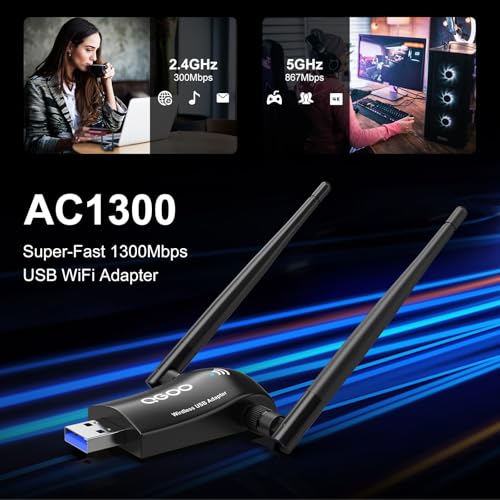 Wireless WiFi Adapter for Desktop PC – QGOO AC1300Mbps USB 3.0 Network Dongle with 5dBi High Gain Dual Antennas, 2.4GHz/5GHz Dual Band for Laptop Computer Compatible Windows11/10/8