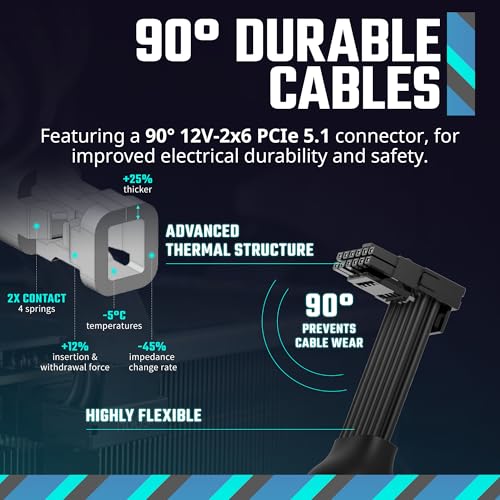 90° Durable Cables: Featuring a 90° 12V-2×6 PCIe 5.1 connector, for improved electrical durability and safety.