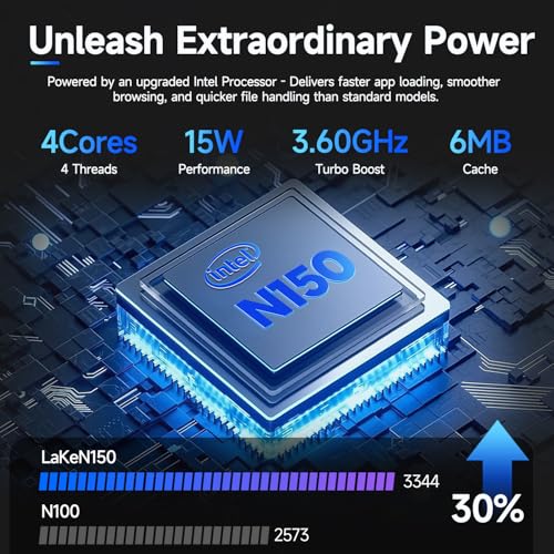 ⚡ 【Intel N150 Processor & Windows 11 Pro】Out-of-Box Performance Ready for Your Tasks.Engineered for daily productivity. The Intel N150 Processor (up to 3.6GHz) facilitates a range of activities from web browsing and document editing to online learning and coding. Pre-installed with Windows 11 Pro, it delivers a professional user experience and advanced security features from the first startup.