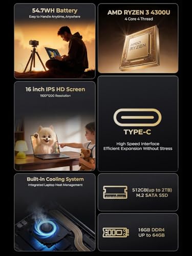 【EFFICIENT PERFORMANCE】KAIGERR Laptop featuring the latest AMD Ryzen 4300U Processor (4 cores/4 threads, up to 3.7GHz). Outperforming the Celeron N5095/N100/N97/N95, it delivers robust multitasking capabilities. The laptop computer has an integrated UHD graphics card clocked at up to 1200MHz for stronger graphics processing performance. KAIGERR laptop is designed to elevate your computing experience.