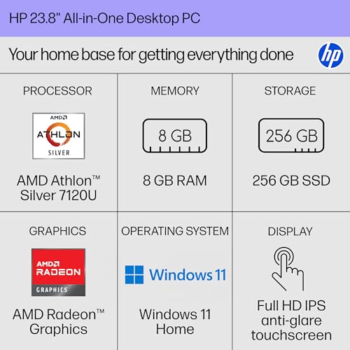 The HP 24-inch All-in-One Desktop takes caring for the planet to the next level. This contemporary, ultra-slim desktop was designed with the planet in mind, while turning your to-do lists into to-done lists with the reliable processing power of the AMD Athlon Silver 7120U processor, upgraded memory, and enhanced multitasking features for heightened performance. Plus, this HP desktop is EPEAT Gold registered and ENERGY STAR certified. This HP computer comes with an HP white wired keyboard, HP white wired mouse, 90 W Smart AC power adapter, setup instructions, and 3 free months of PC Game Pass. HP is here to help. This HP computer comes with 1-year limited hardware warranty and 90-days limited technical support for software and initial setup.