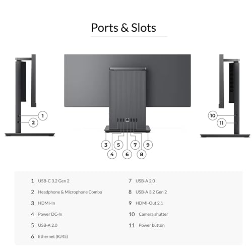 [Tech Specs] 1 x USB-C 3.2 Gen 2, 1 x Headphone & Microphone Combo, 2 x HDMI, 1 x Power DC-In, 1 x Ethernet (RJ45), 2 x USB-A 2.0, 1 x USB-A 3.2 Gen 2, 1 x Camera shutter, 1 x Power button, Wireless Keyboard & Mouse, Wireless Charging Base, Wi-Fi 6