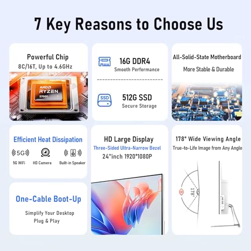 Powerful Performance: Featuring an AMD R7 5700G(8Core Up to 4.6GHz ) and 16G of DDR4 RAM, it offers the ideal set of features to turn you into an unstoppable machine. this all-in-one PC delivers smooth multitasking capabilities and speed for productivity, entertainment and more.