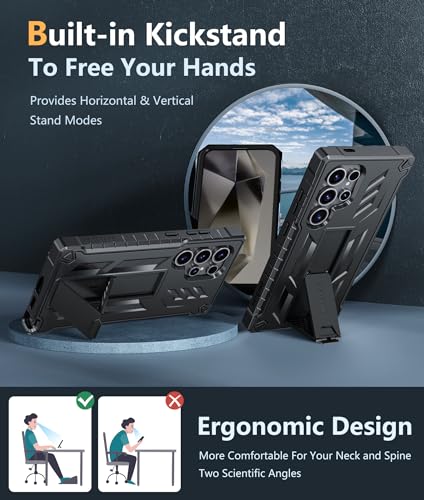Built-In Kickstand: This Galaxy S24 Ultra case with a stand works perfectly both in vertical and horizontal positions. Convenient for reading, watching movies, playing games, browsing the web, and face-to-face chatting with friends.Provides hands-free portrait and landscape viewing angles.