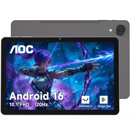 AOC 10.1 inch Android Tablet, Android 16 System, 120Hz Ultra-Smooth Display, 4GB RAM 128GB ROM (1TB Expandable), Octa-Core Processor, Widevine L1 for HD Streaming, Face Unlock, Slim Metal Body, GPS